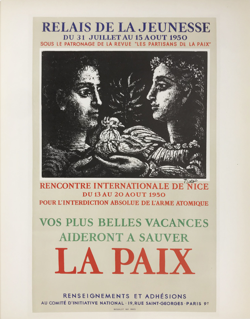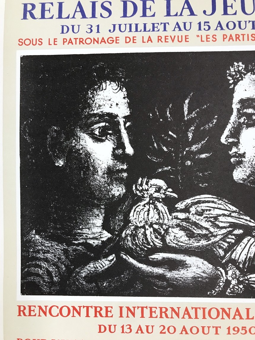 Relais de la Jeunesse, du 31 Juillet au 15 aout 1950 sous le patronage de la revue, ‘les partisans de la Paix’ vos plus belles vacances auderont a sauver La Paix, Pablo Picasso, 젊음의 릴레이, 1950년 7월 31일 부터 8월 15일, ‘평화지지자’ 희극 후원 . 당신의 가장 아름다운 바캉스는 평화를 지키는데 도움을 주는 일 , 파블로 피카소